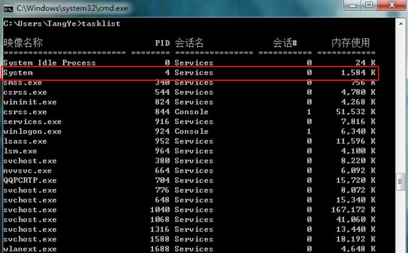 PID=4 的程序是哪一个呢?接着在命令提示和下输入指令 tasklist ,列出所有当前运行的进程,